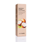 Опаковка и бутилка на Cutisora спрей за термозащита и възстановяване с илюстрация на кокосови орехи, показващи основната съставка, предназначена за суха и увредена коса.